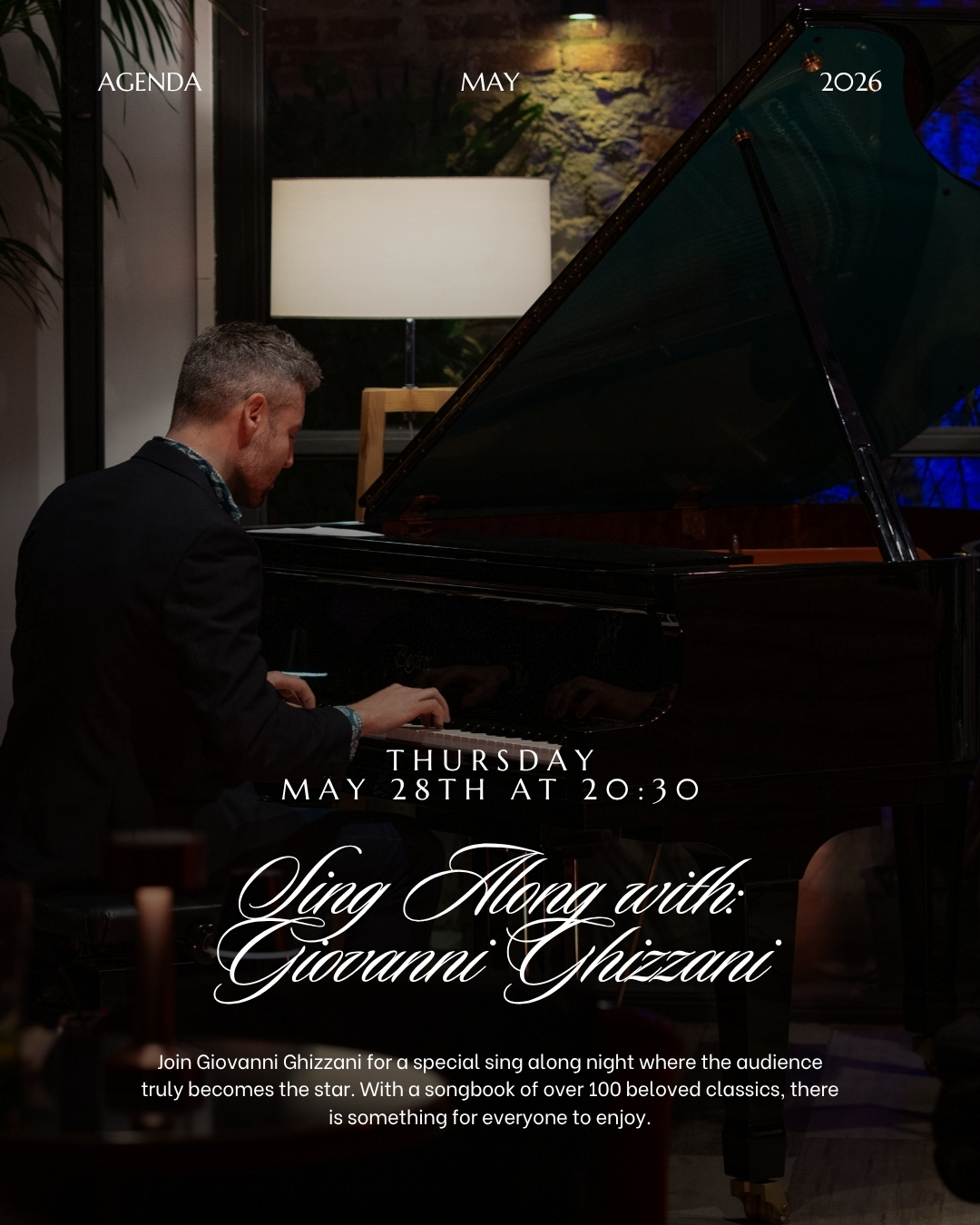 Únete a Giovanni Ghizzani en una noche especial para cantar en la que el público se convierte realmente en la estrella. Con un repertorio de más de 100 clásicos muy queridos, hay algo para que todos disfruten. Viaja a través de estándares del jazz como Autumn Leaves, Summertime y Fly Me to the Moon, déjate llevar por joyas de la bossa nova como The Girl from Ipanema y Wave, o revive éxitos atemporales como Stand by Me, Route 66 y At Last. Elige tu favorita, canta y comparte una velada llena de alegría, música y espíritu comunitario.