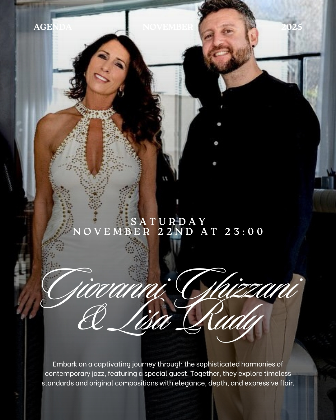 Lisa Rudy, a talented vocalist with a captivating voice and deeply emotional style, joins forces with virtuoso pianist Giovanni Ghizzani, known for his elegance and musical sensitivity. Together, they create an unforgettable experience, blending jazz, soul, and contemporary music in a concert full of magic and connection — a night that promises to transport you through their artistry and passion for music.