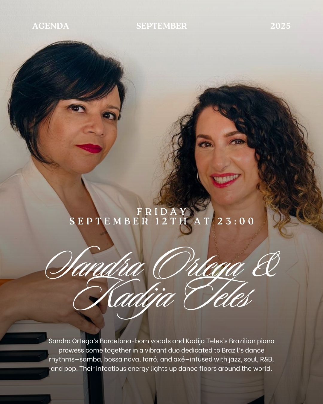 Sandra Ortega’s Barcelona-born vocals and Kadija Teles’s Brazilian piano prowess come together in a vibrant duo dedicated to Brazil’s dance rhythms—samba, bossa nova, forró, and axé—infused with jazz, soul, R&B, and pop. Their infectious energy lights up dance floors around the world.