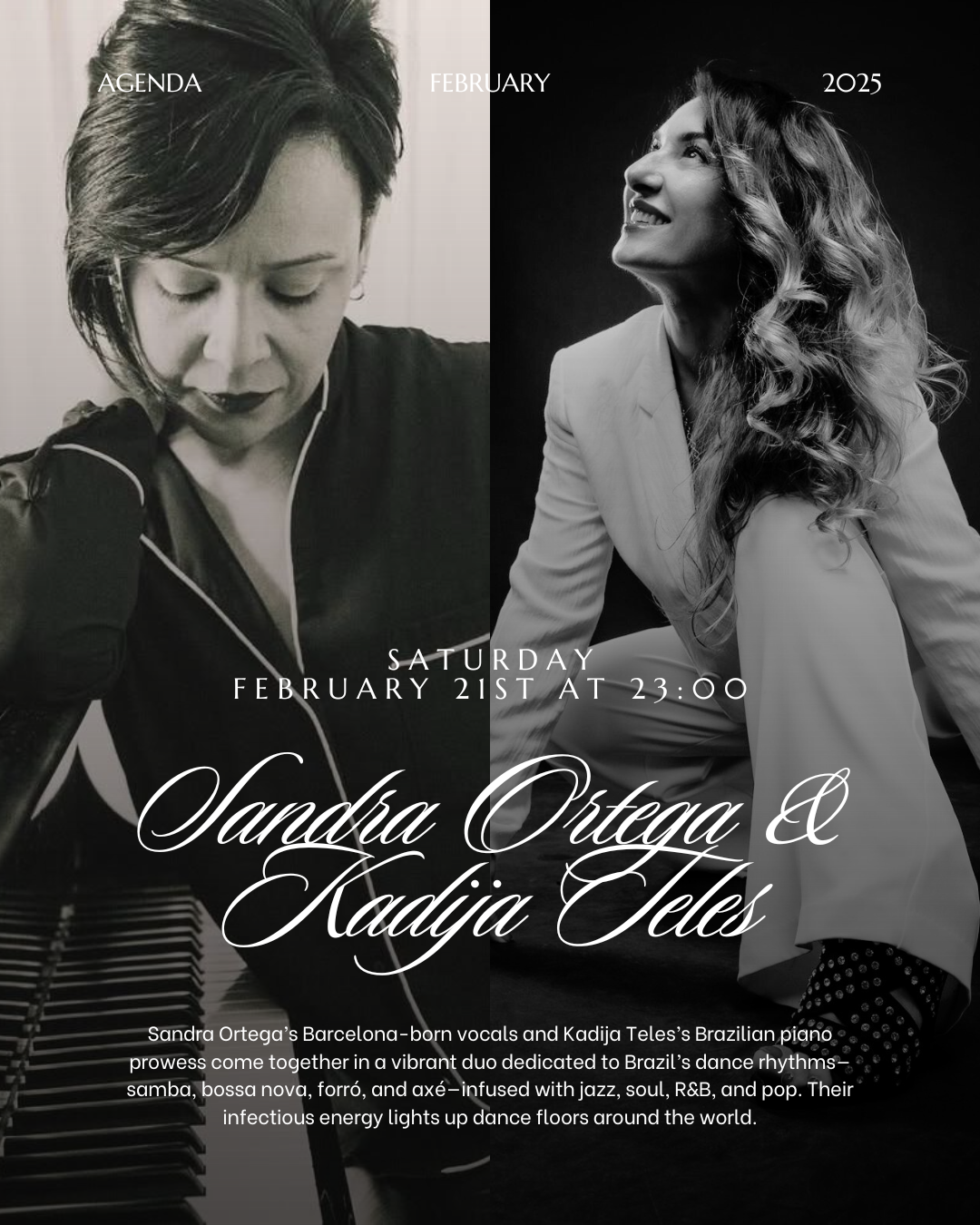We are a musical duo made up of Sandra Ortega, a stunning vocalist from Barcelona, Spain, and Kadija Teles, a talented pianist from Brazil. Representing the identity of our two cultures and blending genres like jazz, Brazilian rhythms, and more, we’ve taken our music to many corners of the world — always earning the love and admiration of our audiences.