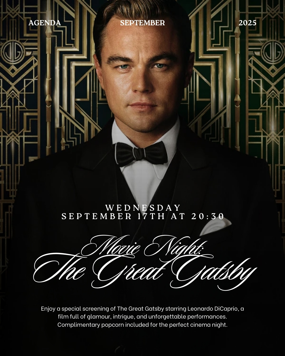 Enjoy a special screening of The Great Gatsby starring Leonardo DiCaprio, a film full of glamour, intrigue, and unforgettable performances. Complimentary popcorn included for the perfect cinema night.