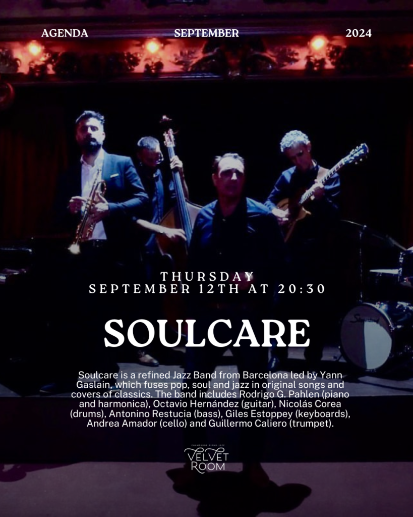 Thursday 12 September 202420:30English | EspañolSoulcare is a refined Jazz Band from Barcelona led by Yann Gaslain, which fuses pop, soul and jazz in original songs and covers of classics. The band includes Rodrigo G. Pahlen (piano and harmonica), Octavio Hernández (guitar), Nicolás Corea (drums), Antonino Restucia (bass), Giles Estoppey (keyboards), Andrea Amador (cello) and Guillermo Caliero (trumpet). BOOK NOW […]September 5, 2023 -